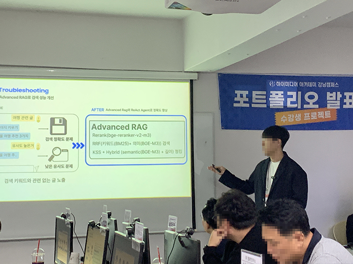 [강남] '심화_생성형 AI활용 인재양성' 부트캠프 과정 10기 프로젝트 발표회 안녕하세요.하이미디어 아카데미 강남캠퍼스에서'심화_생성형 AI활용 인재양성' 과정 10기 프로젝트 발표회가 있었습니다. 하이미디어 아카데미는 앞으로도 여러분의 취업을 위해 최선을 다하겠습니다. 감사합니다.