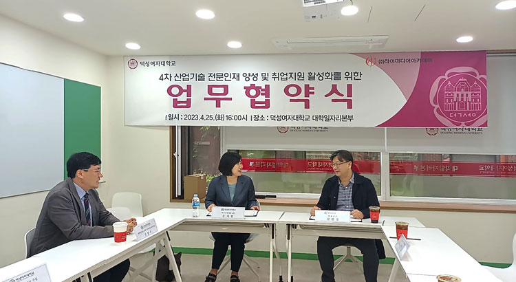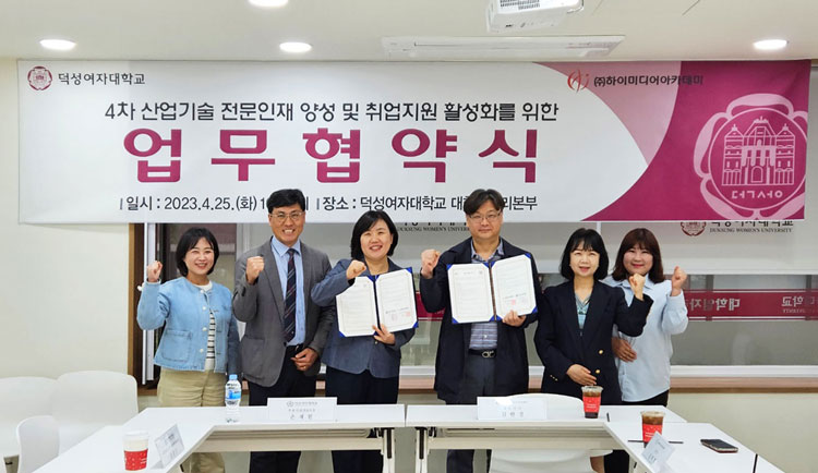 덕성여자대학교와 인재양성 및 취업지원 활성화를 위한 업무협약 체결 안녕하세요. 하이미디어아카데미와 덕성여자대학교가4차 산업기술 전문인재 양성 및 취업지원 활성화를 위한 업무협약을 체결하였습니다. 양 기관은 이번 협약을 통해 4차 산업기술 인재 양성을 위한 교육체계 개발과취·창업 역량개발 및 지원체계 구축 협력을 적극적으로 진행해 나가기로 했습니다. 감사합니다.