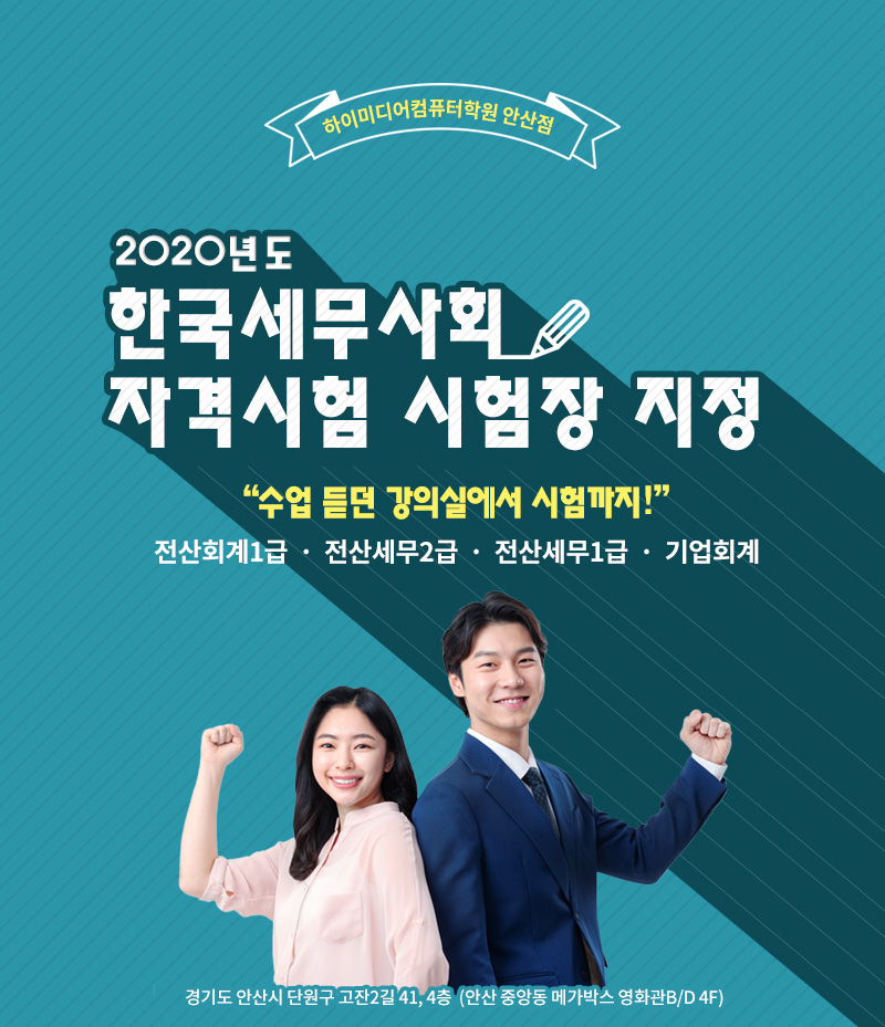 안산 캠퍼스 한국세무사회 자격시험 시험장 지정 Post. 2020.06.17 하이미디어 컴퓨터학원 안산점(경기도 단원구 고잔2길 41 4층 - 안산 중앙동 메가박스 영화관건물 4층)이한국세무사회 자격시험 시험장으로 지정되었습니다.이제 수업 듣던 강의실에서 편안하게 자격시험까지 응시하세요! 감사합니다.