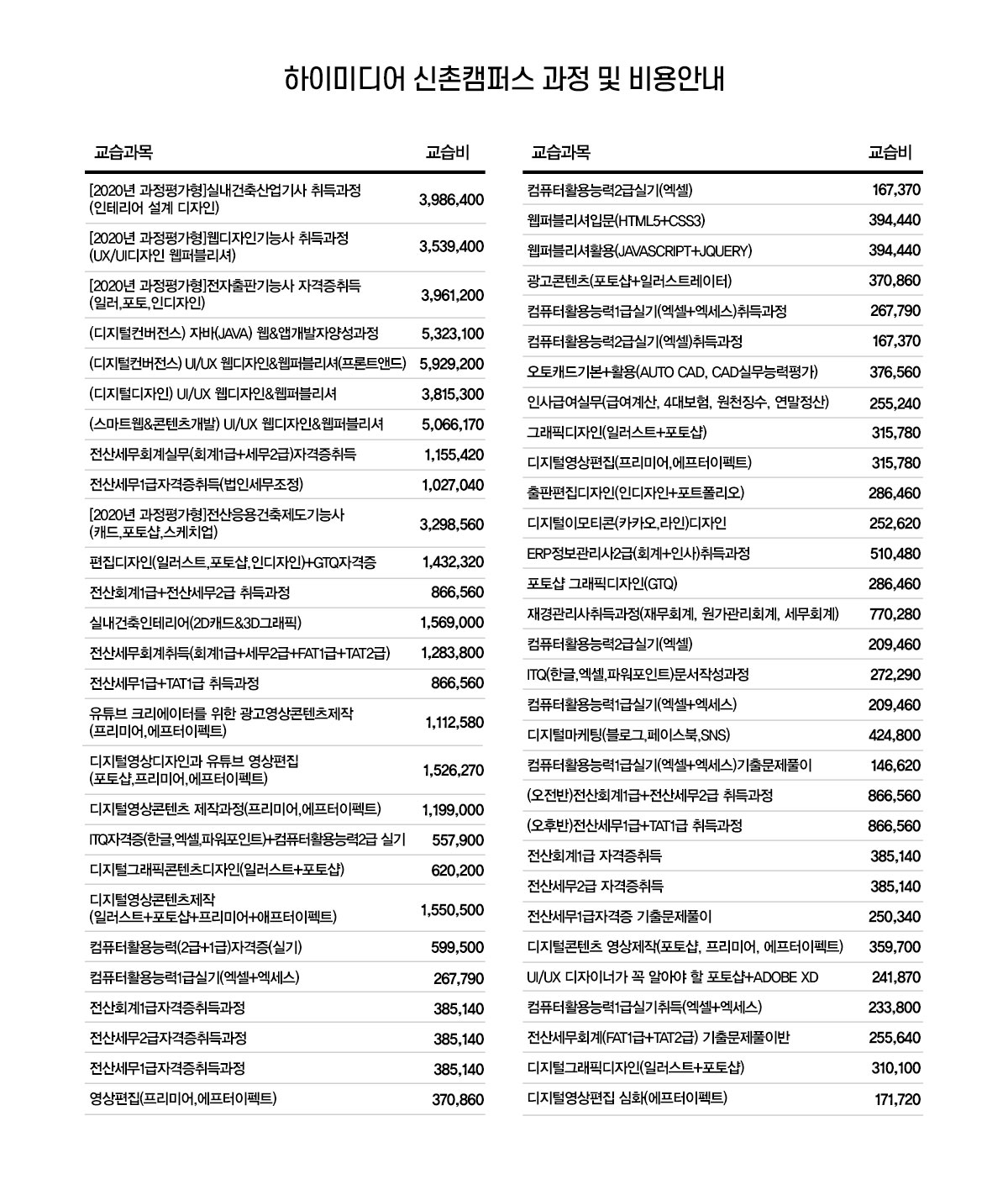 2020 신촌캠퍼스 교습비게시표