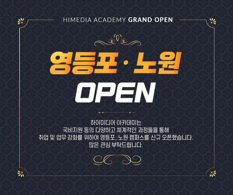 하이미디어 영등포 · 노원 캠퍼스 8월 오픈 Post. 2021.07.16 안녕하세요.하이미디어 아카데미는국비지원 및 다양하고 체계적인 과정들을 통해훈련생분들의 취업과 직장인분들의 업무 강화를 위해영등포, 노원에 신규 캠퍼스를 오픈합니다. 보다 가까이 여러분 곁을 찾아가는 하이미디어에 많은 관심 부탁드립니다.감사합니다.