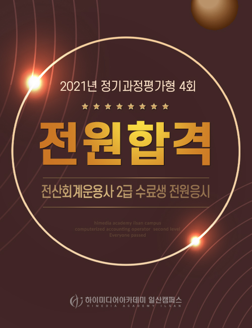 일산 캠퍼스 2021년 정기과정평가형 전산회계 운용사 2급 '전원합격' Post. 2021.10.05 2021년 정기 과정평가형 4회 전산회계운용사 2급에 응시한 일산캠퍼스 수료생 15명 전원이 응시하여 전원합격하였습니다. 국가에서 인정한 공인시험센터를 운영하여 수업을 들은 강의실에서 시험에 응시할 수 있는 하이미디어 아카데미는 교육의 질적 향상과 여러분의 취업을 위하여노력을 다하고 있습니다. 감사합니다.