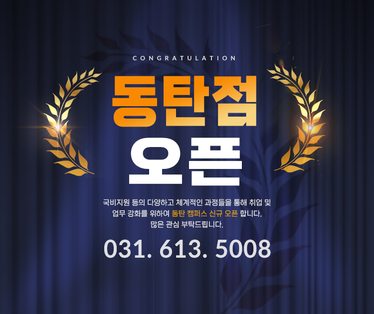 하이미디어 '동탄점' 오픈 Post. 2021.10.06 안녕하세요. 하이미디어 아카데미는국비지원 및 다양하고 체계적인 과정들을 통해훈련생분들의 취업과 직장인분들의 업무 강화를 위해경기도 동탄에 신규 캠퍼스를 오픈했습니다. 궁금하신 사항은 031. 613. 5008 로 연락주시면친절히 답변드리겠습니다.감사합니다.
