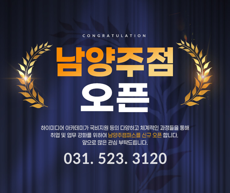 하이미디어 '남양주점' 오픈 Post. 2022.07.04 안녕하세요. 하이미디어 아카데미는 국비지원 및 다양하고 체계적인 과정들을 통해훈련생분들의 취업과 직장인분들의 업무 강화를 위해경기도 남양주에 신규 캠퍼스를 오픈했습니다.(주소 : 경기 남양주시 늘을2로 메인씨네마타워 7층 ) 궁금하신 사항은 031. 523. 3120 으로 연락 주시면친절히 답변 드리겠습니다. 감사합니다.