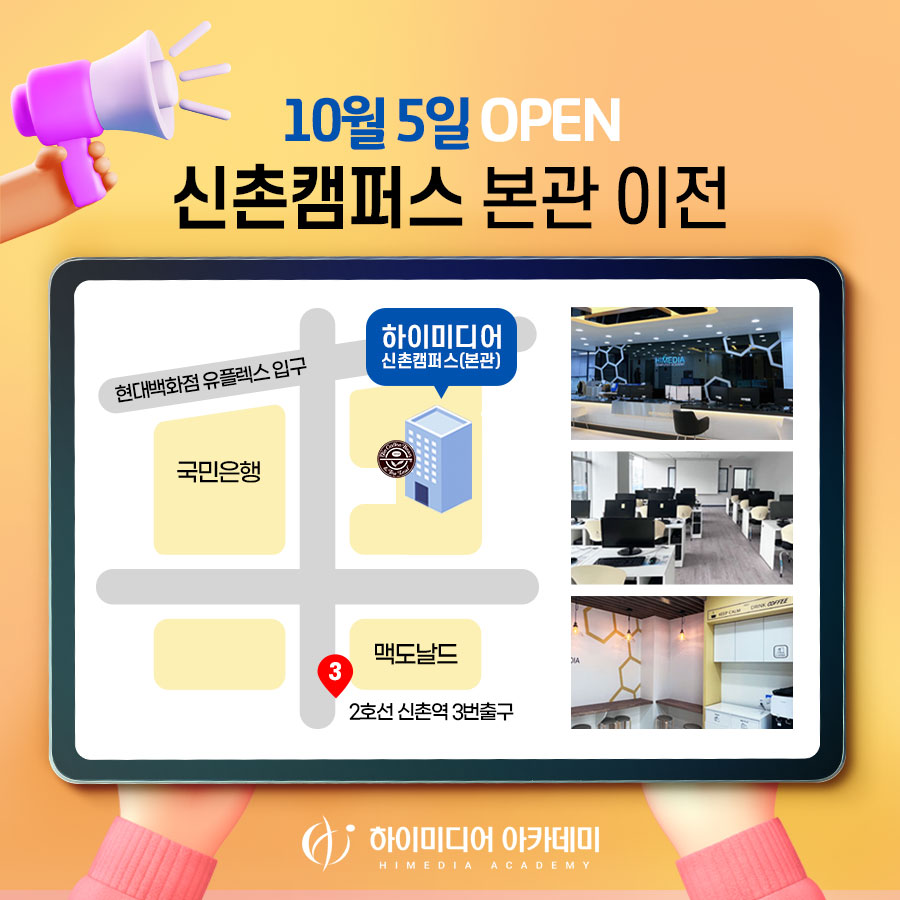 신촌 캠퍼스 신촌캠퍼스 본관 이전 Post. 2022.10.12 안녕하세요. 하이미디어 아카데미 신촌캠퍼스 본관은 수강생 여러분들을 위해 보다 쾌적하고 편리한 수업 환경을 마련하고자10월 5일 '서울 서대문구 연세로 8-1 버티고타워 7층' 으로 이전합니다.앞으로도 많은 관심부탁드립니다.