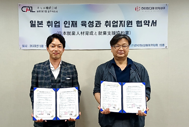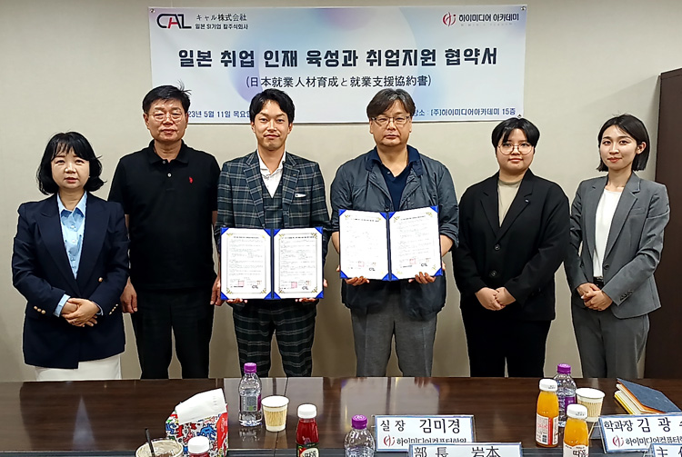 하이미디어 일본 SI기업 CAL 주식회사와의 업무 협약식 Post. 2023.05.11 안녕하세요.하이미디어 아카데미는 K-디지털 트레이닝 프로그램 비롯한 다양한 직무역량 강화 프로그램으로청년 고용 창출을 위한 일본 취업 인재 육성과 취업 지원 협약식을일본 SI기업 CAL 주식회사와 체결했습니다. 4차 산업기술, 직무역량을 겸비한 청년들의 해외 취업을 통한글로벌 인재 양성의 기회가 될 것입니다.앞으로도 다양하고 우수한 무료 국비 교육과정을 활용하여청년 취업에 도움이 되도록 노력하겠습니다.감사합니다.