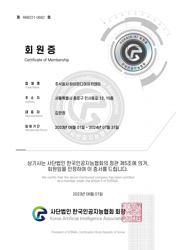 하이미디어 하이미디어아카데미 한국인공지능협회 회원사 선정 Post. 2023.08.02 과학기술정보통신부 산하 한국인공지능협회(www.koraia.org)에하이미디어아카데미가 회원사로 심사, 통과되어 1년간 회원사로 활동하게 되었습니다. 앞으로 다양한 인프라 공유를 통해서 다양한 도전과 기회 창출로 연결될 수 있도록 많은 관심 부탁 드립니다. 감사합니다.