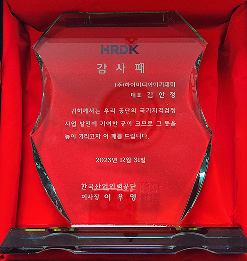하이미디어 하이미디어 아카데미, 한국산업인력공단 감사패 수상 Post. 2023.12.21 안녕하세요. 하이미디어 아카데미는 한국산업인력공단으로부터공단의 국가자격검정 사업 발전에 기여한 공을 인정받아감사패를 수상하게 되었습니다.앞으로도 더욱 노력하는 하이미디어 아카데미가 되도록 하겠습니다.감사합니다.