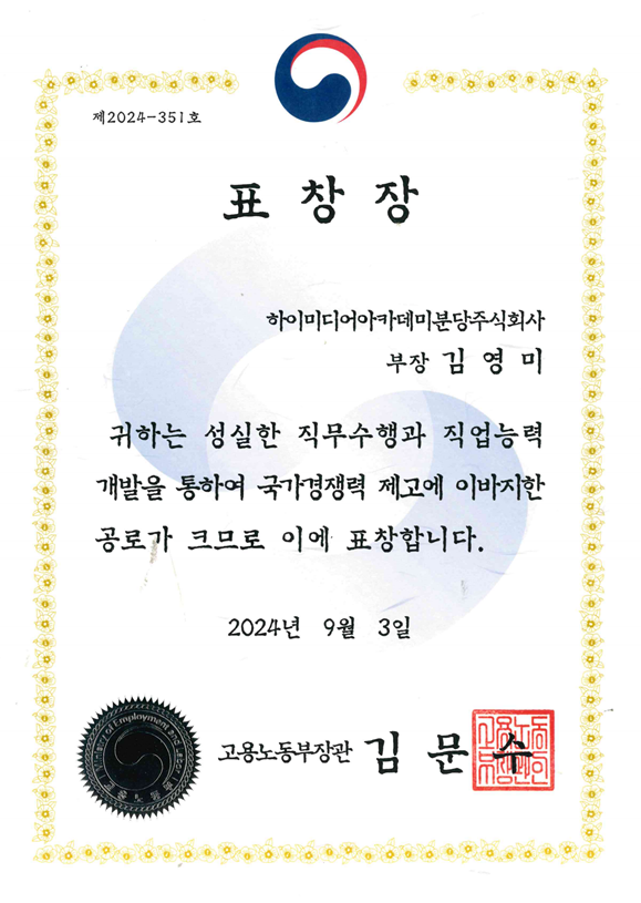 하이미디어 아카데미 분당캠퍼스(김영미 부원장)가 수상을 하게 되었습니다.