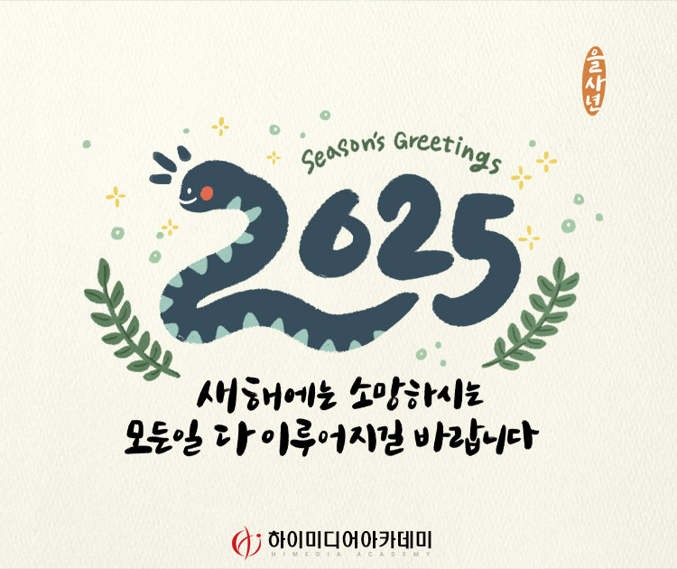 하이미디어 새해 복 많이 받으세요~ Post. 2024.12.27 2025년 을사년,새해에는 소망하시는 모든일 다 이뤄지시길 바랍니다.무엇보다 원하시는 취업의 문이 활짝 열려보다 뜻깊은 한 해가 되시길 소망합니다. 또한 여러분의 가정에도 행복과 사랑이 가득하시길 바랍니다.새해 복 많이 받으세요. - 하이미디어 아카데미 임직원 일동