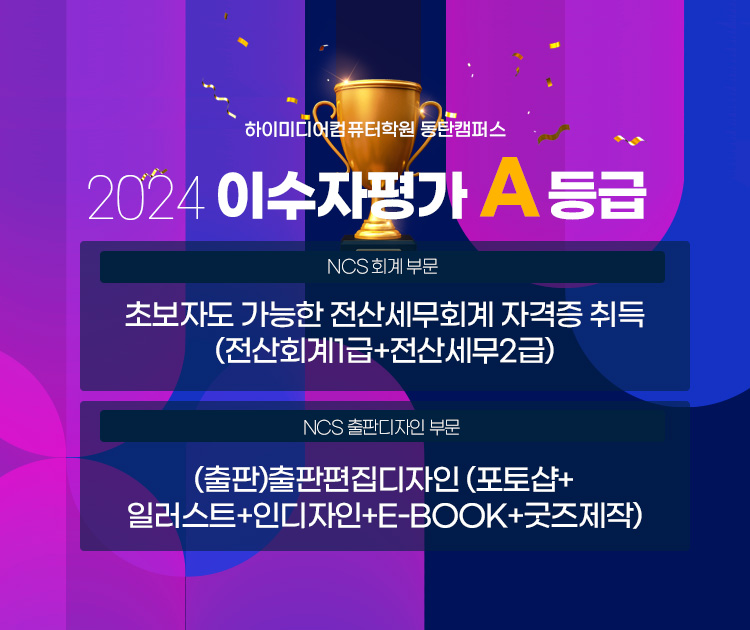 2024 이수자평가 A등급 획득 '(출판)출판편집디자인...' , '초보자도 가능한 전산세무회계 자격증 취득...'