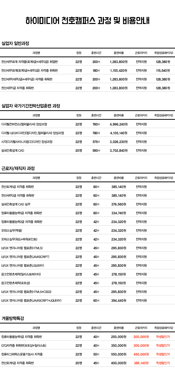 [하이미디어아카데미] 천호점 수강료 안내