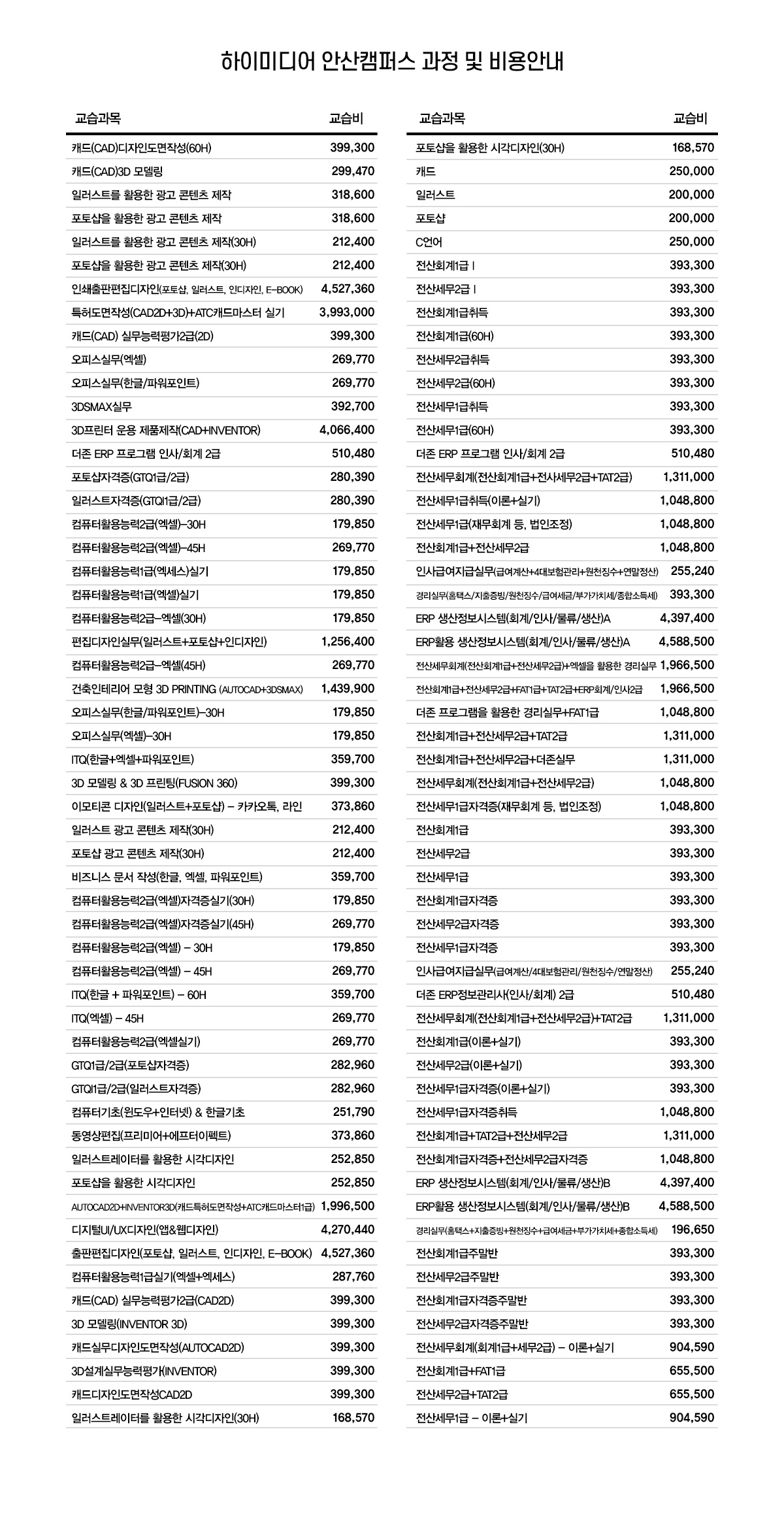 안산 캠퍼스의 교습과정 및 비용 내용입니다.